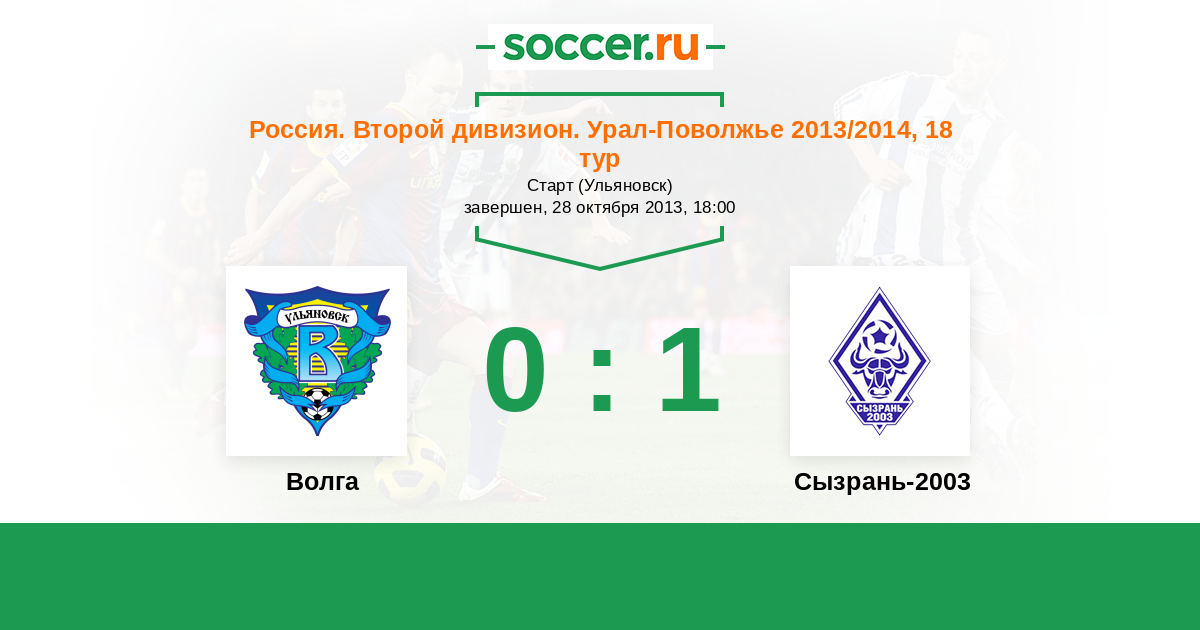 Россия. Вторая лига. Группа 4 04.09.2013 Сызрань-2003 Логотип футбольный клуб Сызрань-2003 2:0 Логотип футбольный клуб Волга (Ульяновск) Волга