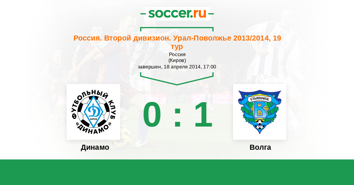 Россия. Вторая лига. Группа 4 18.04.2013 Волга Логотип футбольный клуб Волга (Ульяновск) 1:0 Логотип футбольный клуб Динамо Киров Динамо Киров