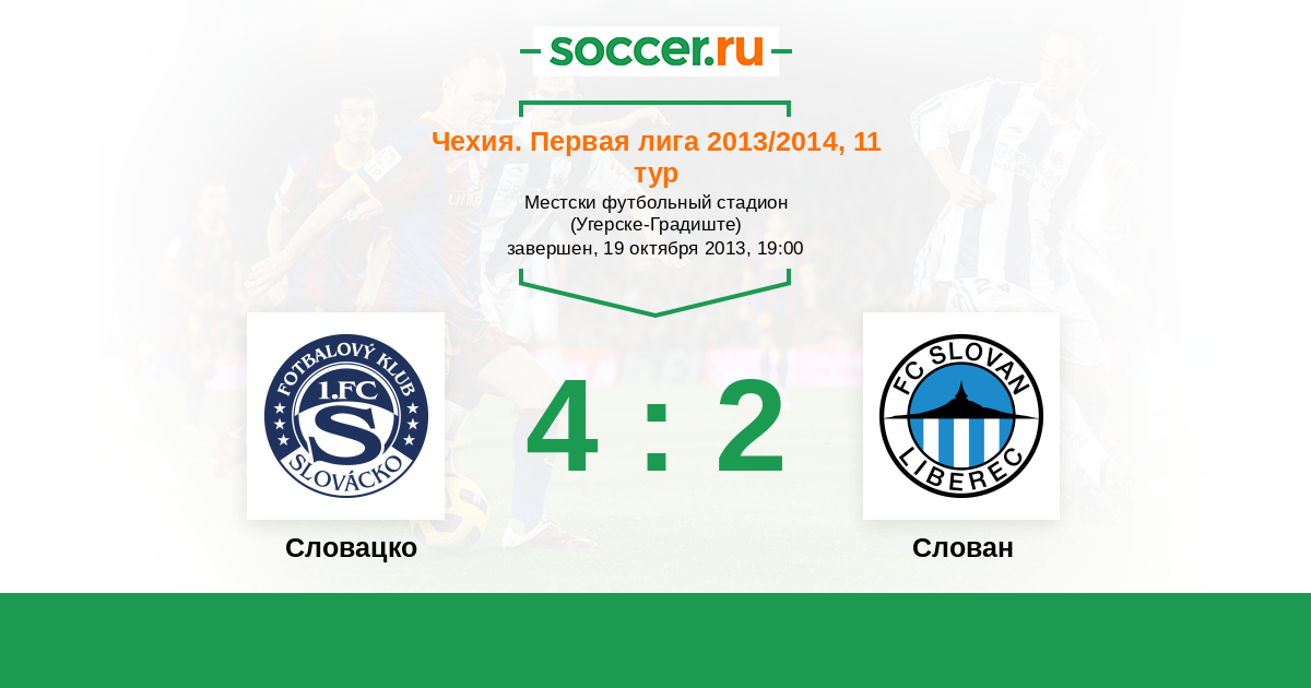 Чехия. Первая Лига 19.04.2014 Слован Логотип футбольный клуб Слован (Либерец) 2:1 Логотип футбольный клуб Словацко (Угерске-Градиште) Словацко