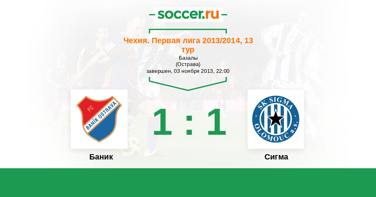 Чехия. Первая Лига 15.03.2013 Сигма Логотип футбольный клуб Сигма (Оломоуц) 1:0 Логотип футбольный клуб Баник (Острава) Баник