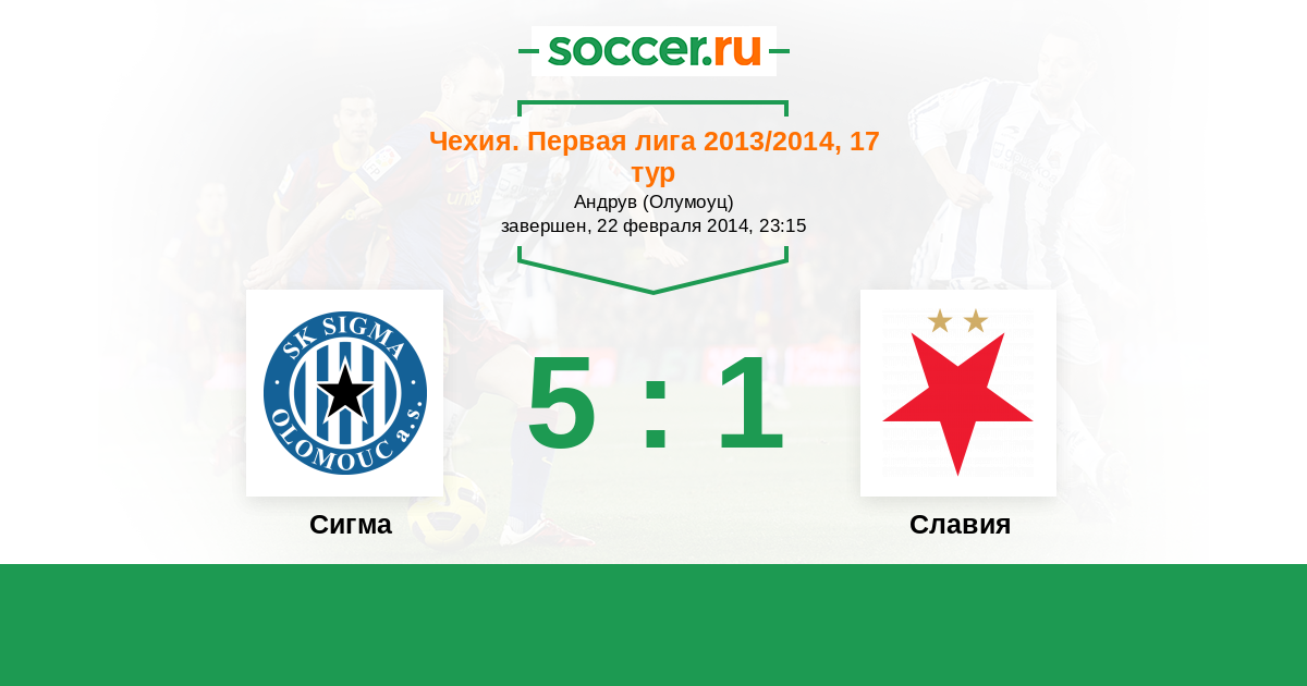 Чехия. Первая Лига 24.02.2013 Сигма Логотип футбольный клуб Сигма (Оломоуц) 2:1 Логотип футбольный клуб Славия (Прага) Славия