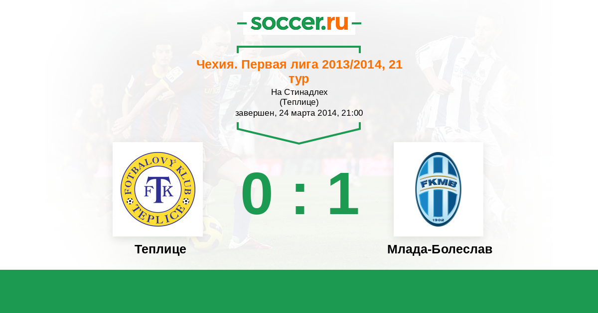 Чехия. Первая Лига 01.09.2013 Млада-Болеслав Логотип футбольный клуб Млада-Болеслав 1:0 Логотип футбольный клуб Теплице Теплице
