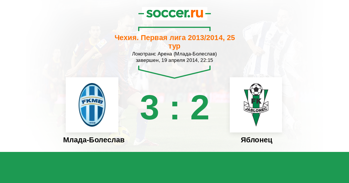 Чехия. Кубок 03.04.2014 Млада-Болеслав Логотип футбольный клуб Млада-Болеслав 1:0 Логотип футбольный клуб Яблонец (Яблонец-над-Нисоу) Яблонец