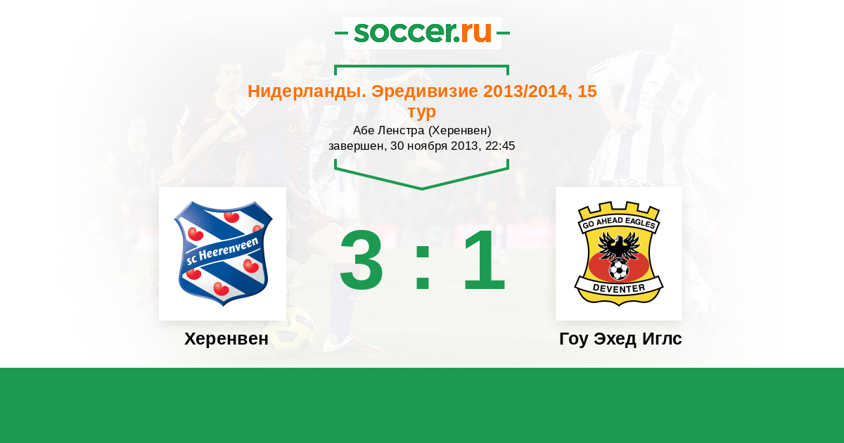 Нидерланды. Эредивизи 12.04.2014 Гоу Эхед Иглс Логотип футбольный клуб Гоу Эхед Иглс (Девентер) 0:2 Логотип футбольный клуб Херенвен Херенвен