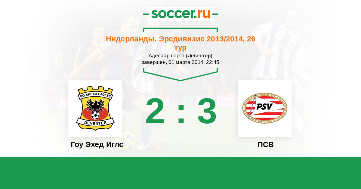 Нидерланды. Эредивизи 17.08.2013 ПСВ Логотип футбольный клуб ПСВ (Эйндховен) 3:0 Логотип футбольный клуб Гоу Эхед Иглс (Девентер) Гоу Эхед Иглс