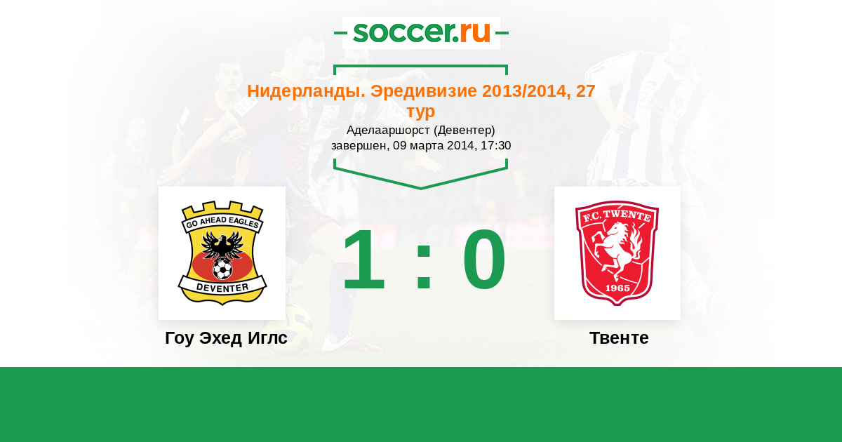 Нидерланды. Эредивизи 02.04.2017 Твенте Логотип футбольный клуб Твенте (Энсхеде) 1:2 Логотип футбольный клуб Гоу Эхед Иглс (Девентер) Гоу Эхед Иглс