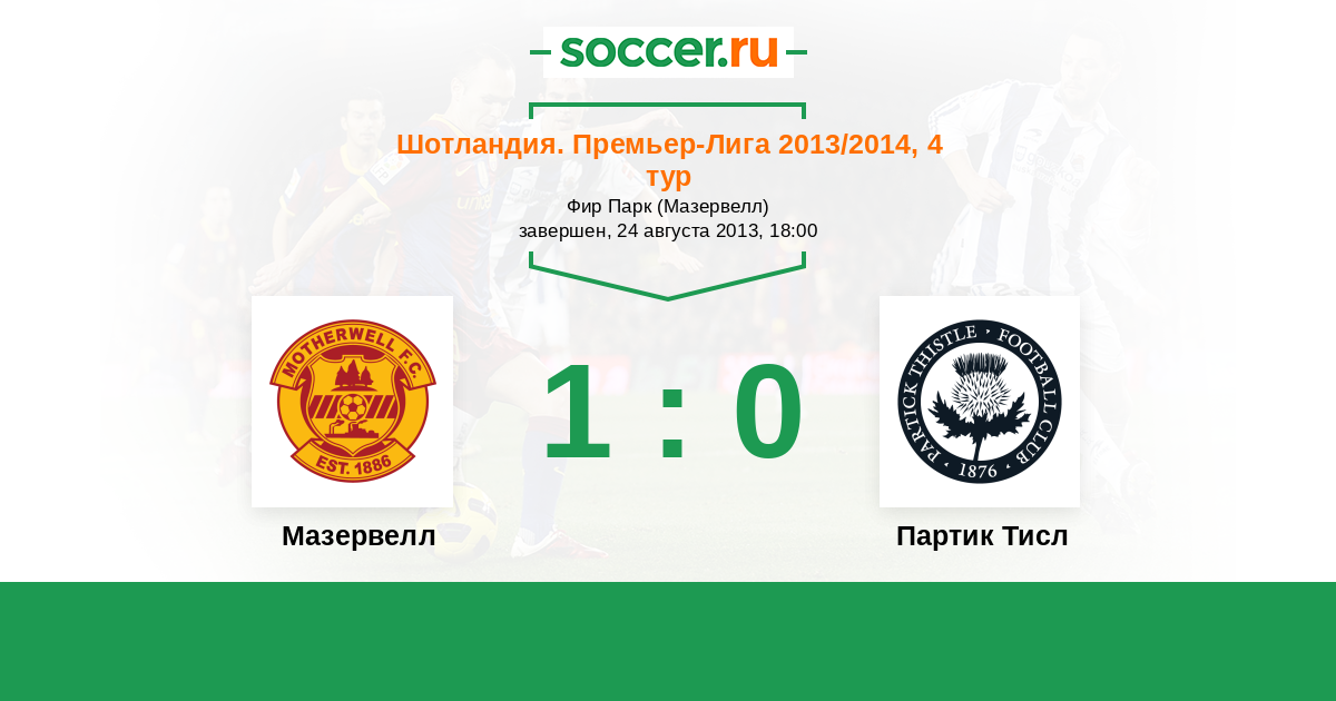 Шотландия. Премьер-Лига 04.10.2014 Партик Тисл Логотип футбольный клуб Партик Тисл (Глазго) 3:1 Логотип футбольный клуб Мазервелл Мазервелл