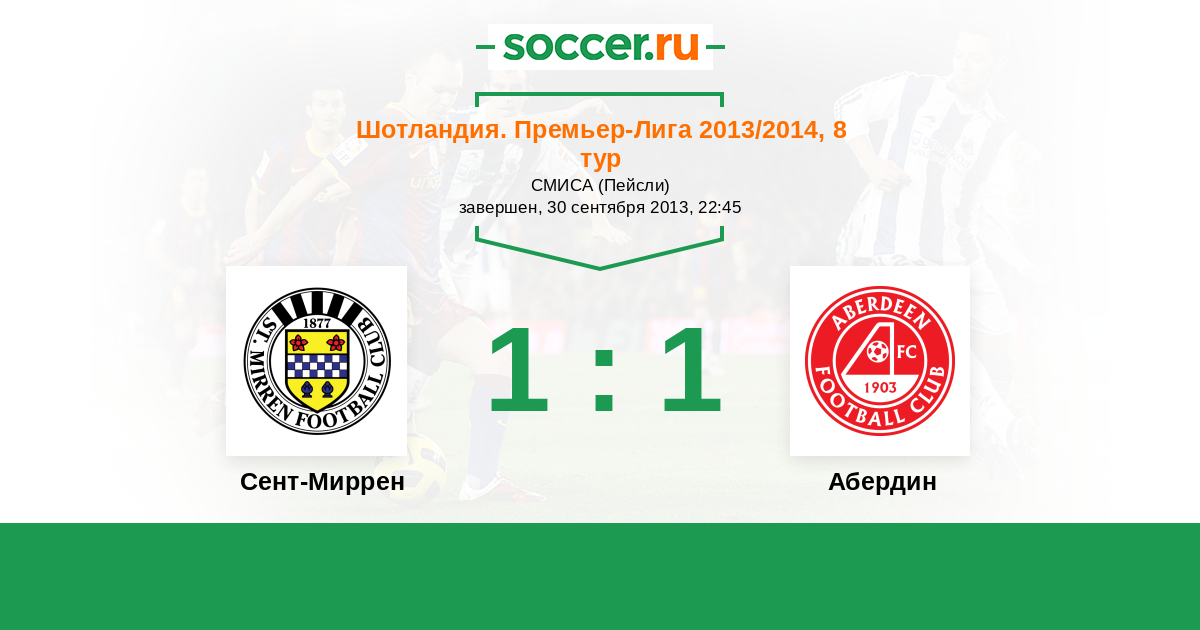 Шотландия. Премьер-Лига 30.09.2014 Абердин Логотип футбольный клуб Абердин 2:2 Логотип футбольный клуб Сент-Миррен (Пейсли) Сент-Миррен