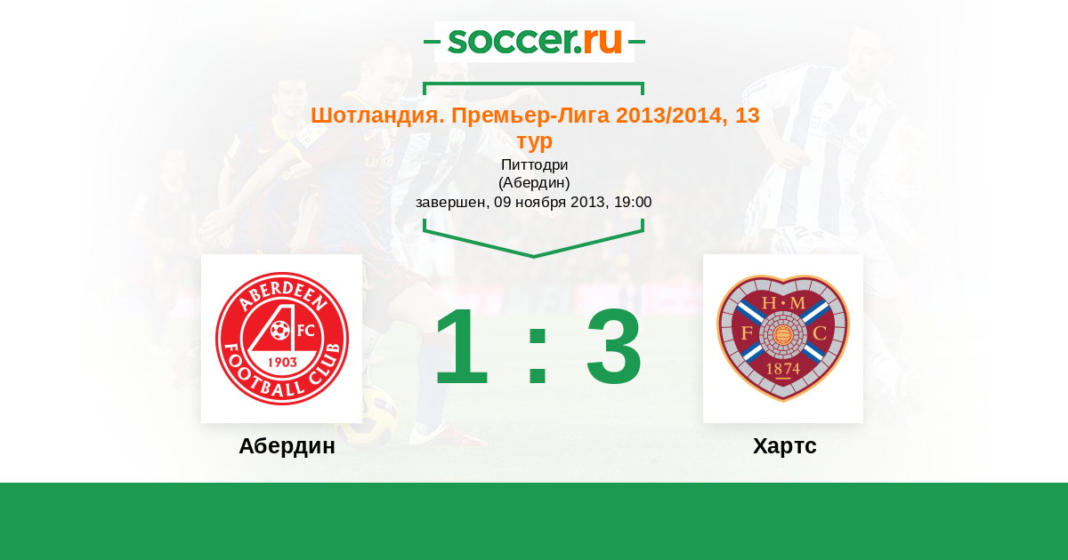 Шотландия. Премьер-Лига 24.08.2013 Хартс Логотип футбольный клуб Хартс (Эдинбург) 2:1 Логотип футбольный клуб Абердин Абердин