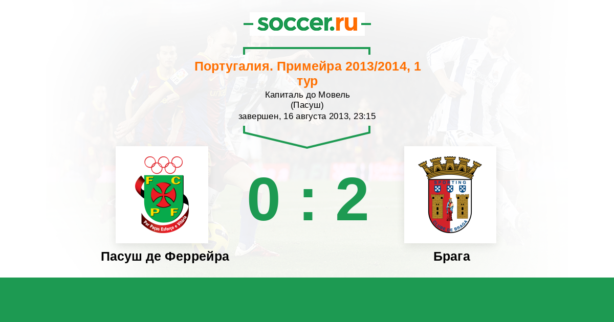 Португалия. Примейра 02.09.2012 Пасуш де Феррейра Логотип футбольный клуб Пасуш де Феррейра 2:0 Логотип футбольный клуб Брага Брага
