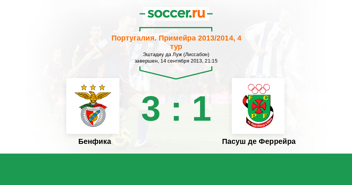 Португалия. Примейра 16.02.2014 Пасуш де Феррейра Логотип футбольный клуб Пасуш де Феррейра 0:2 Логотип футбольный клуб Бенфика (Лиссабон) Бенфика