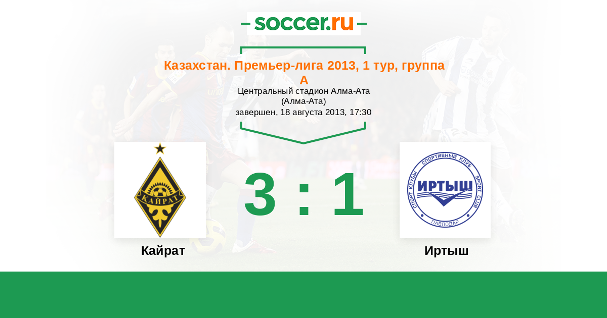 Казахстан. Премьер-лига 28.07.2013 Кайрат Логотип футбольный клуб Кайрат (Алматы) 3:2 Логотип футбольный клуб Иртыш (Павлодар) Иртыш
