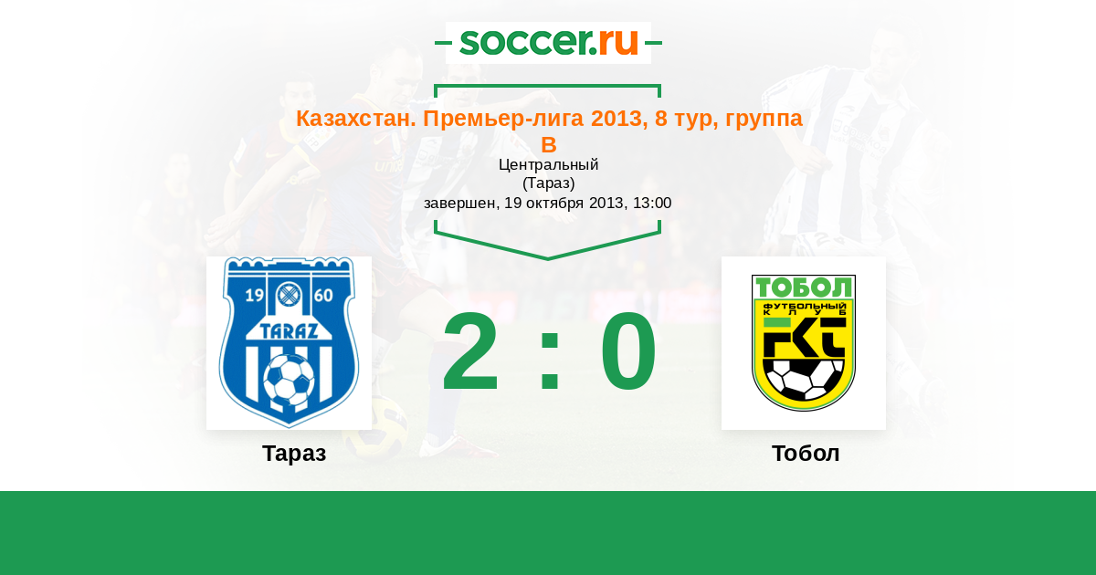 Казахстан. Премьер-лига 14.09.2013 Тобол Логотип футбольный клуб Тобол (Костанай) 2:0 Логотип футбольный клуб Тараз Тараз