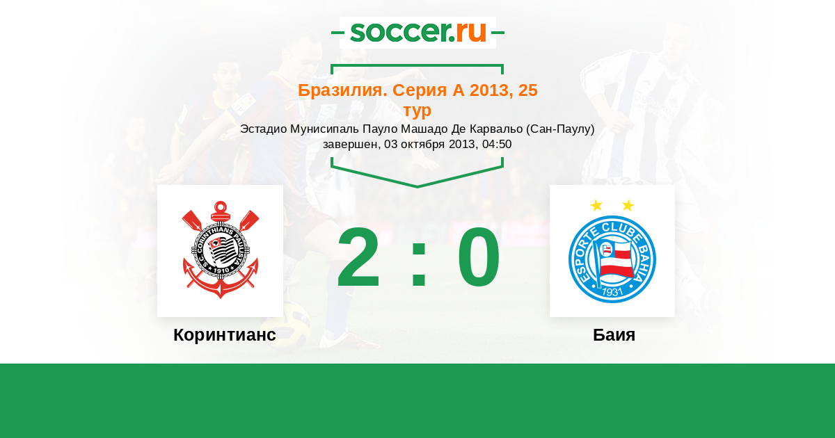 Бразилия. Серия А 20.10.2012 Коринтианс Логотип футбольный клуб Коринтианс (Сан-Паулу) 1:1 Логотип футбольный клуб Баия (Салвадор) Баия