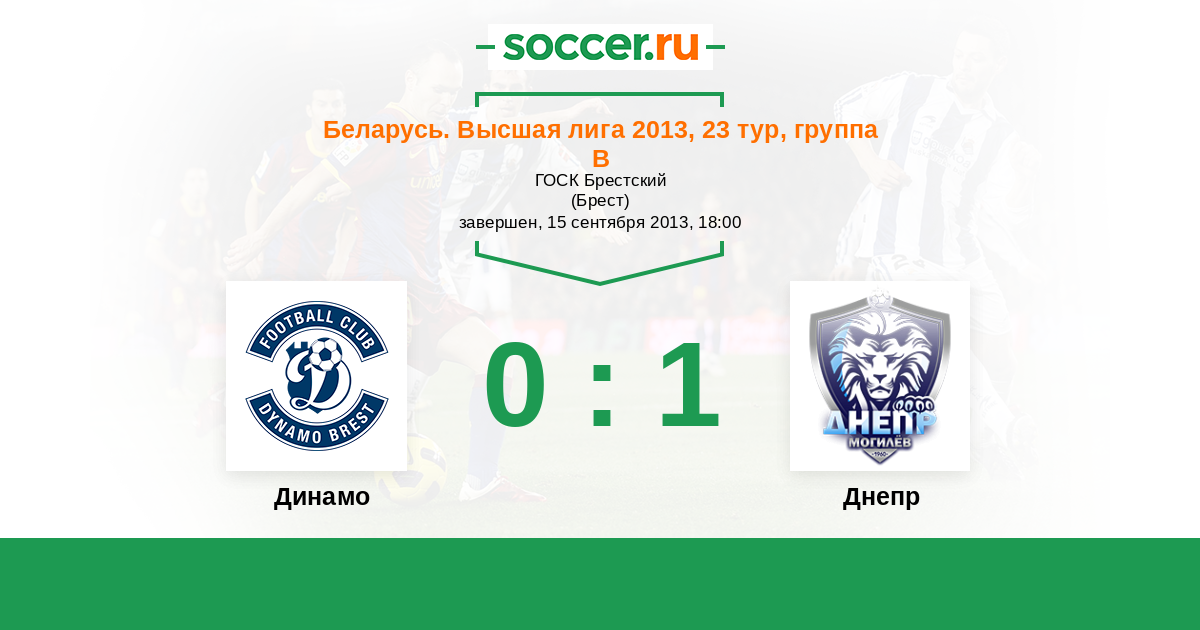 Беларусь. Высшая лига 10.08.2013 Динамо Логотип футбольный клуб Динамо (Брест) 2:0 Логотип футбольный клуб Днепр (Могилев) Днепр