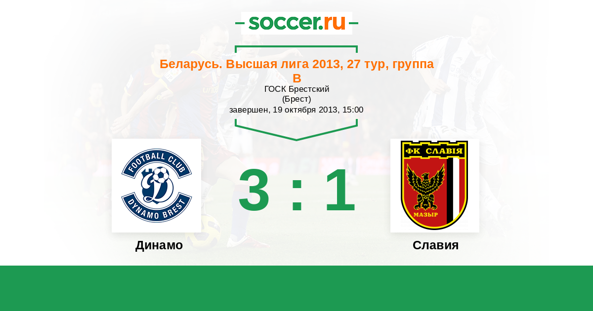 Беларусь. Высшая лига 17.08.2013 Славия Логотип футбольный клуб Славия (Мозырь) 1:1 Логотип футбольный клуб Динамо (Брест) Динамо