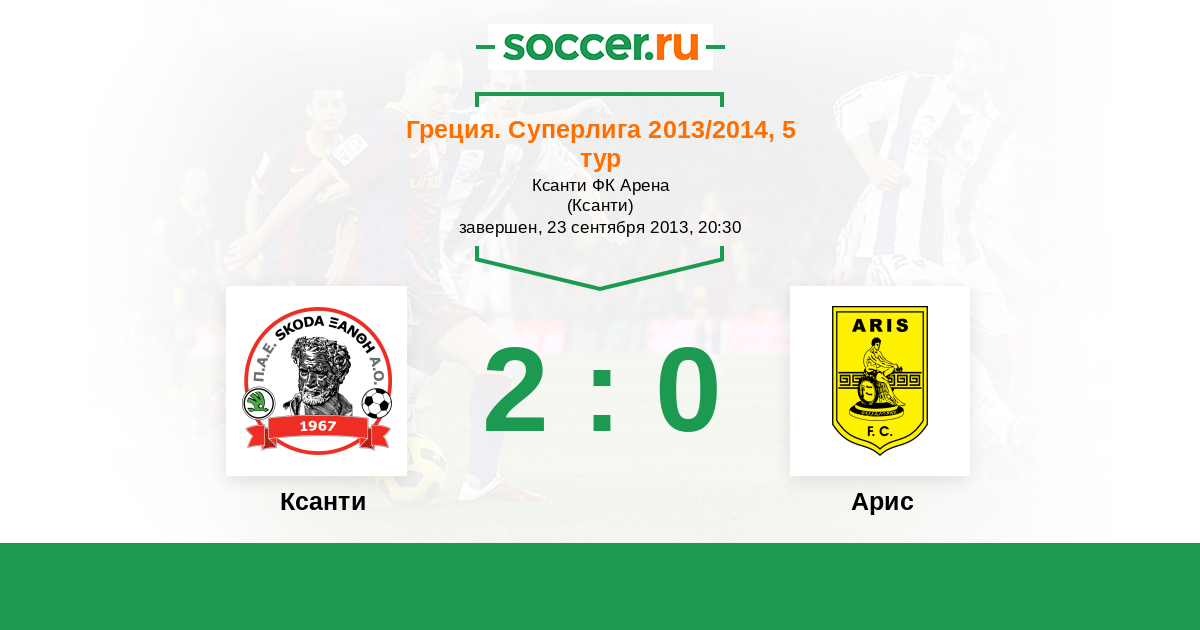 Греция. Суперлига 21.04.2013 Ксанти Логотип футбольный клуб Ксанти 0:0 Логотип футбольный клуб Арис (Салоники) Арис