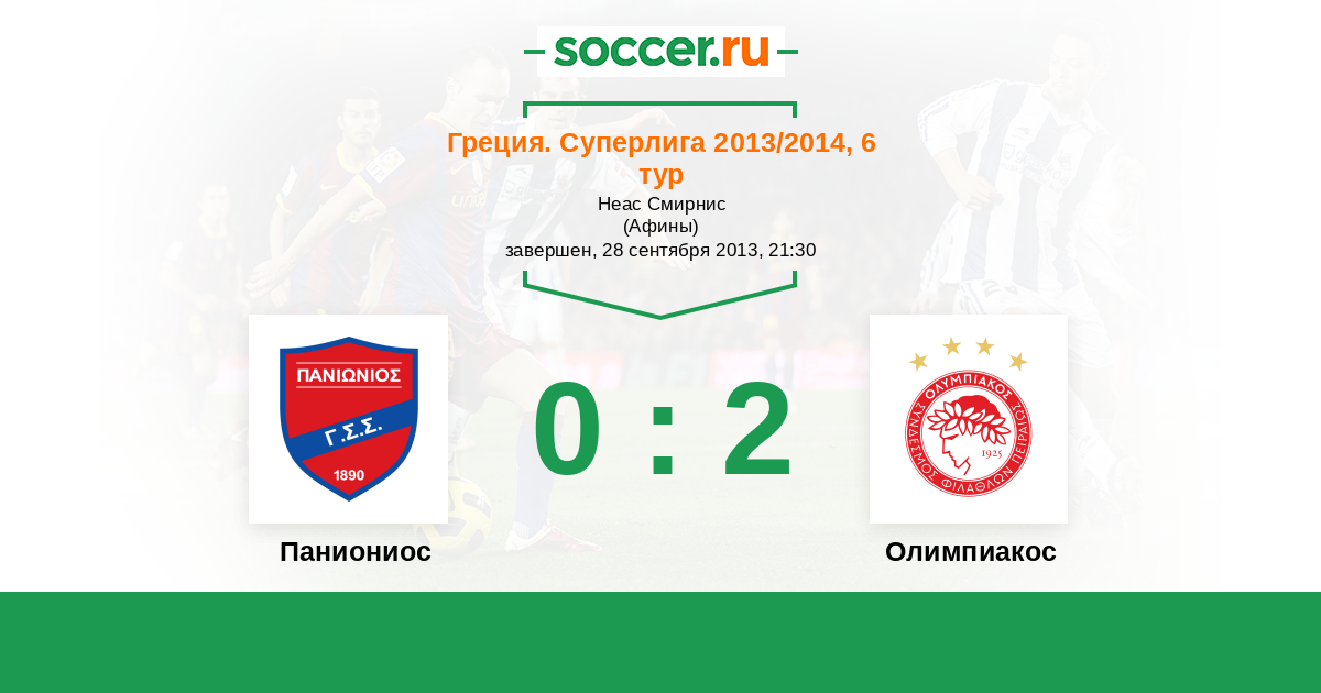 Греция. Суперлига 21.04.2013 Олимпиакос Логотип футбольный клуб Олимпиакос (Пирей) 2:1 Логотип футбольный клуб Паниониос (Афины) Паниониос