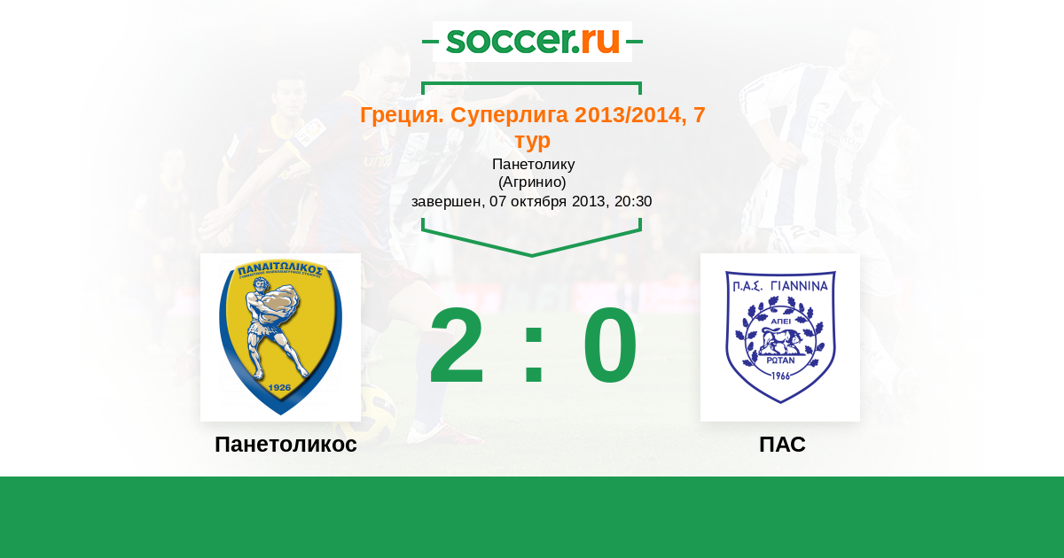 Греция. Суперлига 31.10.2016 Панетоликос Логотип футбольный клуб Панетоликос (Агринио) 1:2 Логотип футбольный клуб ПАС (Яннина) ПАС