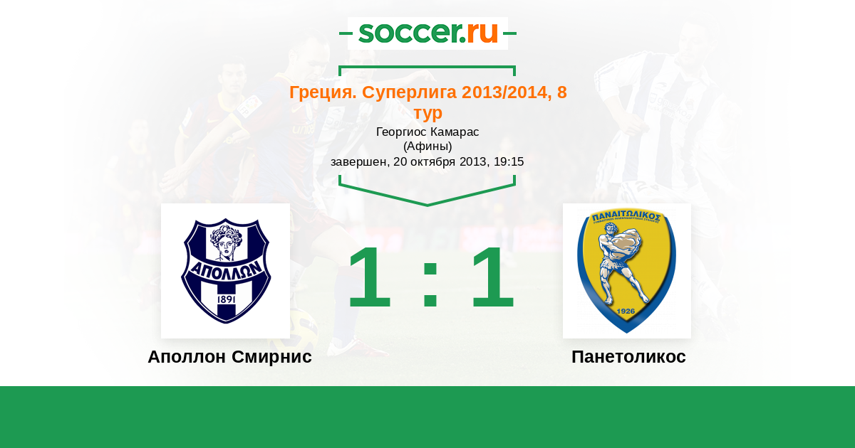 Греция. Суперлига 29.10.2017 Панетоликос Логотип футбольный клуб Панетоликос (Агринио) 1:1 Логотип футбольный клуб Аполлон Смирнис (Афины) Аполлон Смирнис