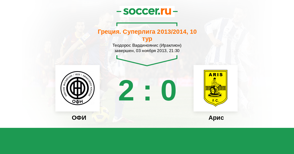 Греция. Суперлига 01.03.2014 Арис Логотип футбольный клуб Арис (Салоники) 0:0 Логотип футбольный клуб ОФИ (Ираклион) ОФИ