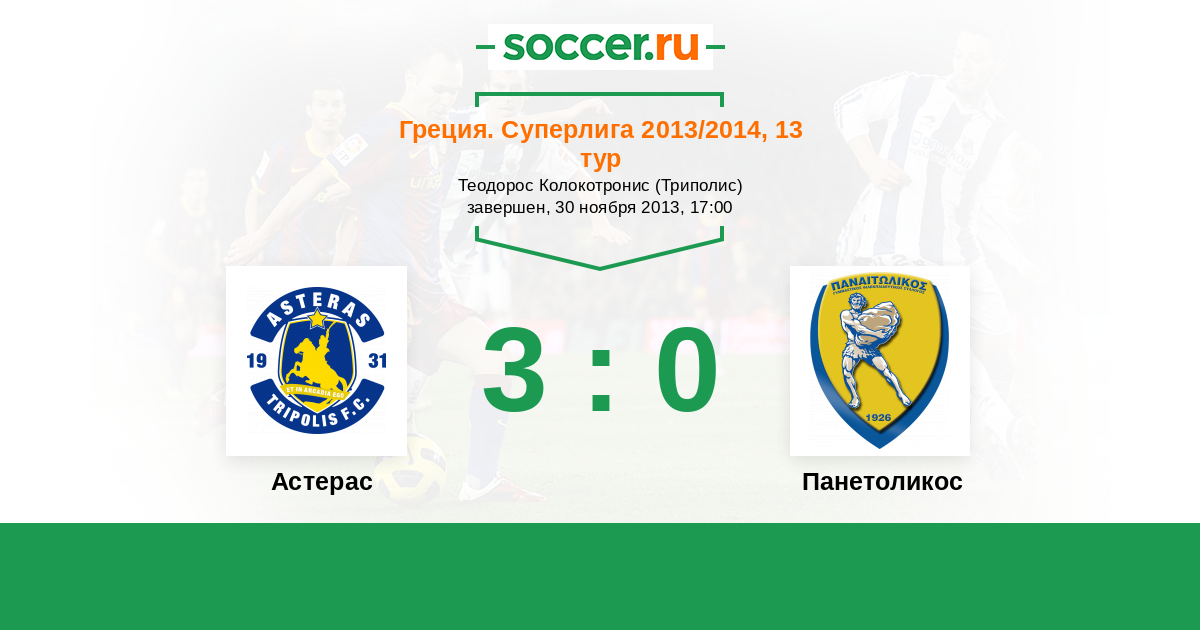Греция. Суперлига 22.03.2014 Панетоликос Логотип футбольный клуб Панетоликос (Агринио) 0:1 Логотип футбольный клуб Астерас (Триполис) Астерас