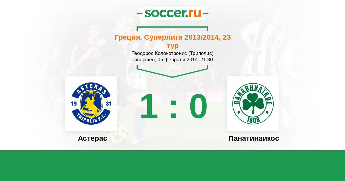 Греция. Суперлига 11.05.2014 Панатинаикос Логотип футбольный клуб Панатинаикос (Афины) 1:0 Логотип футбольный клуб Астерас (Триполис) Астерас