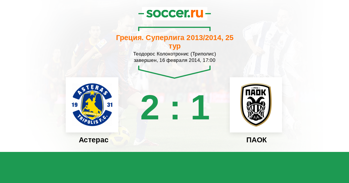 Греция. Суперлига 27.02.2016 ПАОК Логотип футбольный клуб ПАОК (Салоники) 2:0 Логотип футбольный клуб Астерас (Триполис) Астерас