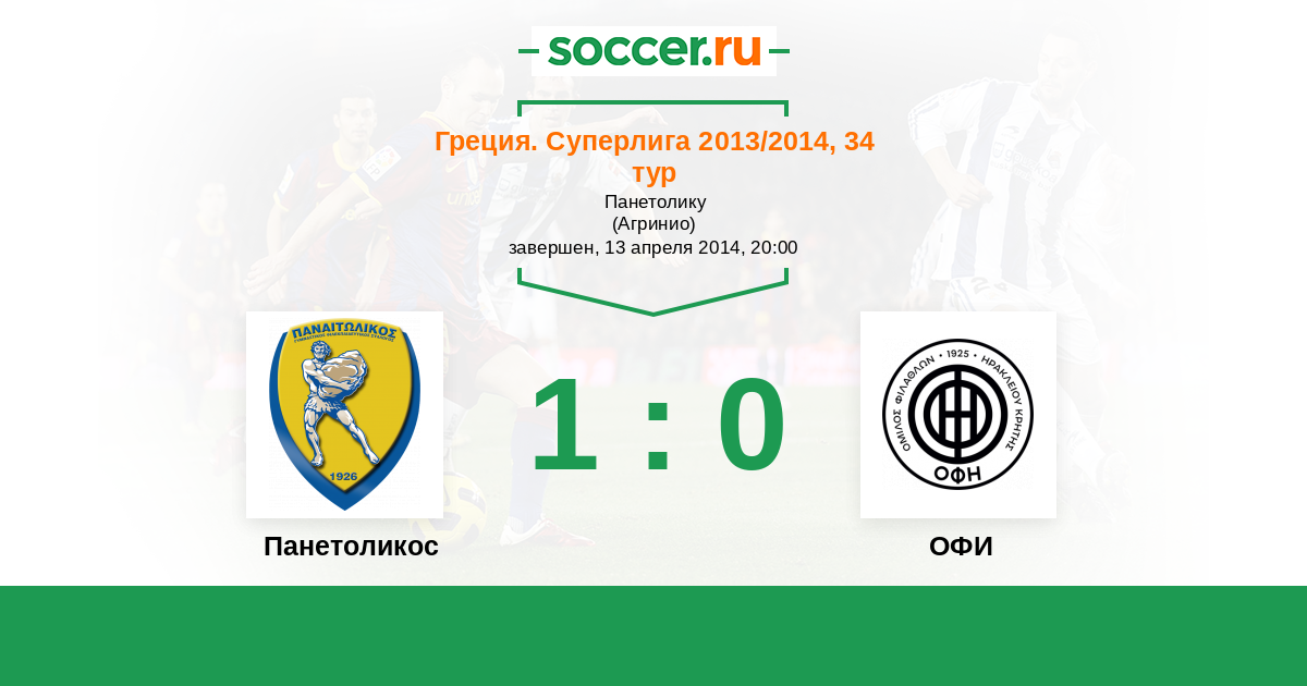 Греция. Суперлига 21.12.2013 ОФИ Логотип футбольный клуб ОФИ (Ираклион) 2:1 Логотип футбольный клуб Панетоликос (Агринио) Панетоликос