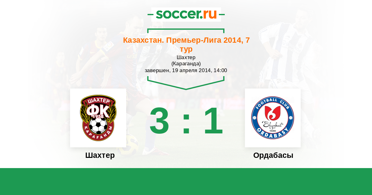 Казахстан. Премьер-лига 22.06.2014 Ордабасы Логотип футбольный клуб Ордабасы (Шымкент) 2:1 Логотип футбольный клуб Шахтер (Караганда) Шахтер