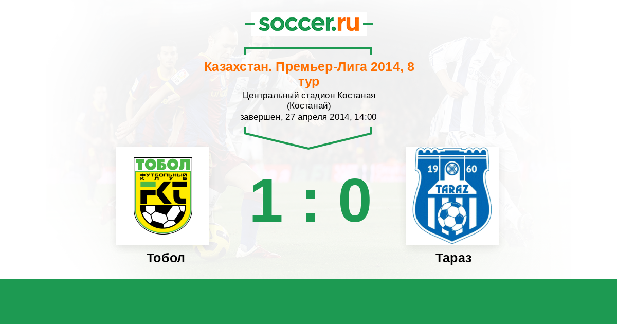 Казахстан. Премьер-лига 14.09.2014 Тобол Логотип футбольный клуб Тобол (Костанай) 3:0 Логотип футбольный клуб Тараз Тараз