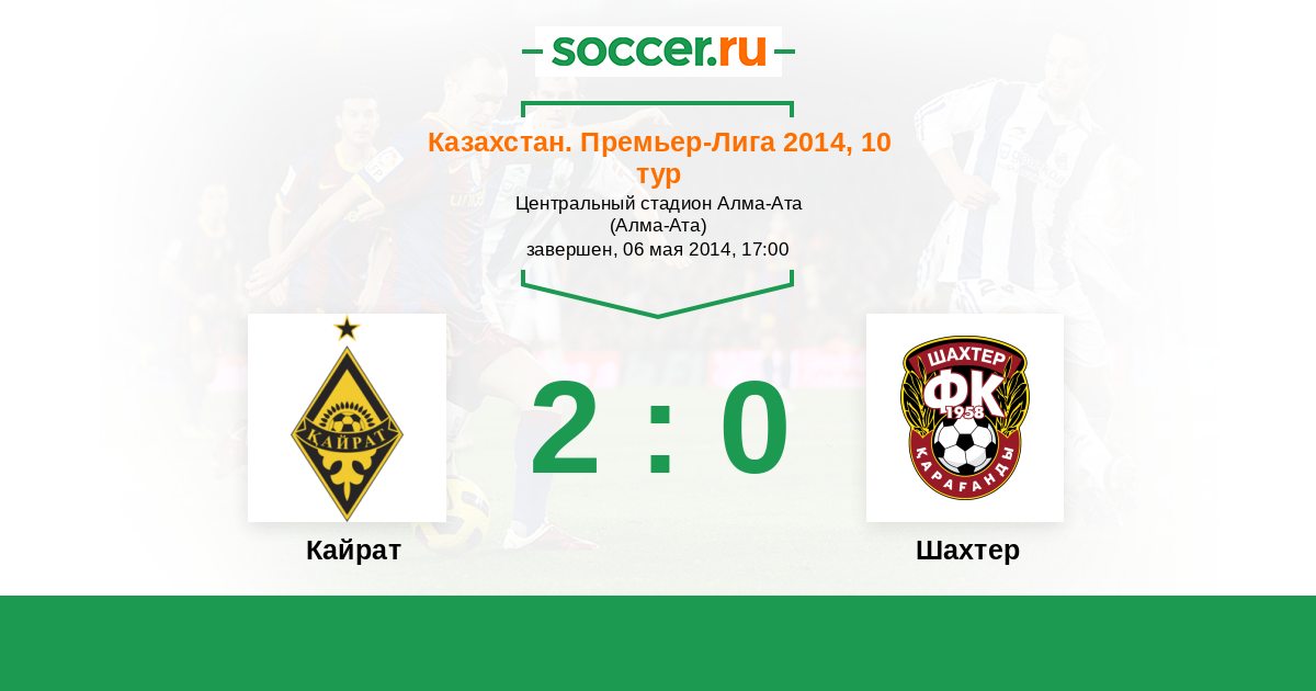 Казахстан. Премьер-лига 05.05.2013 Шахтер Логотип футбольный клуб Шахтер (Караганда) 2:1 Логотип футбольный клуб Кайрат (Алматы) Кайрат