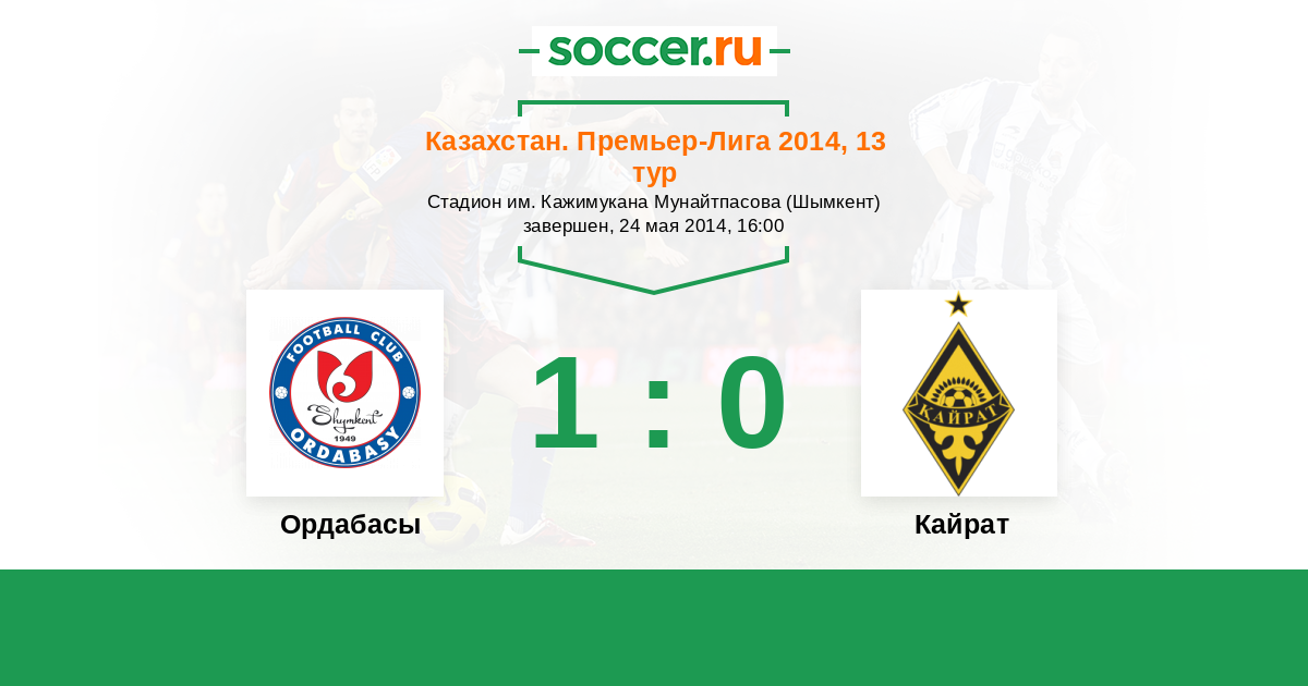 Казахстан. Премьер-лига 24.04.2013 Ордабасы Логотип футбольный клуб Ордабасы (Шымкент) 1:0 Логотип футбольный клуб Кайрат (Алматы) Кайрат