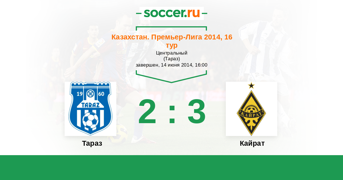 Казахстан. Премьер-лига 30.05.2013 Кайрат Логотип футбольный клуб Кайрат (Алматы) 2:1 Логотип футбольный клуб Тараз Тараз