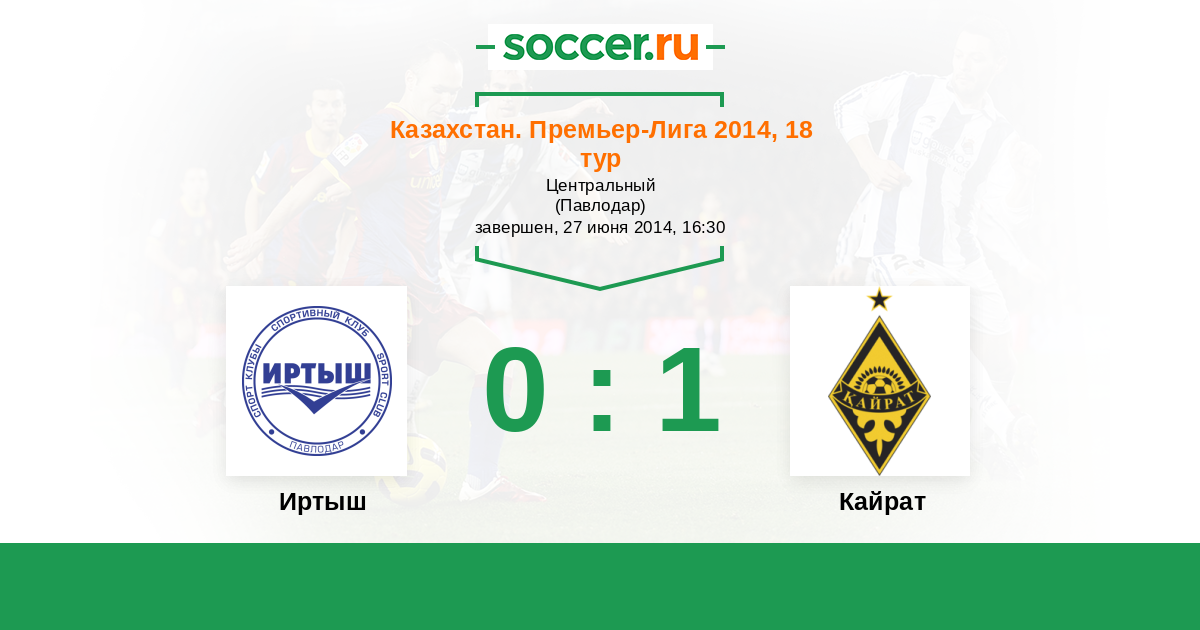 Казахстан. Премьер-лига 16.06.2012 Кайрат Логотип футбольный клуб Кайрат (Алматы) 0:0 Логотип футбольный клуб Иртыш (Павлодар) Иртыш