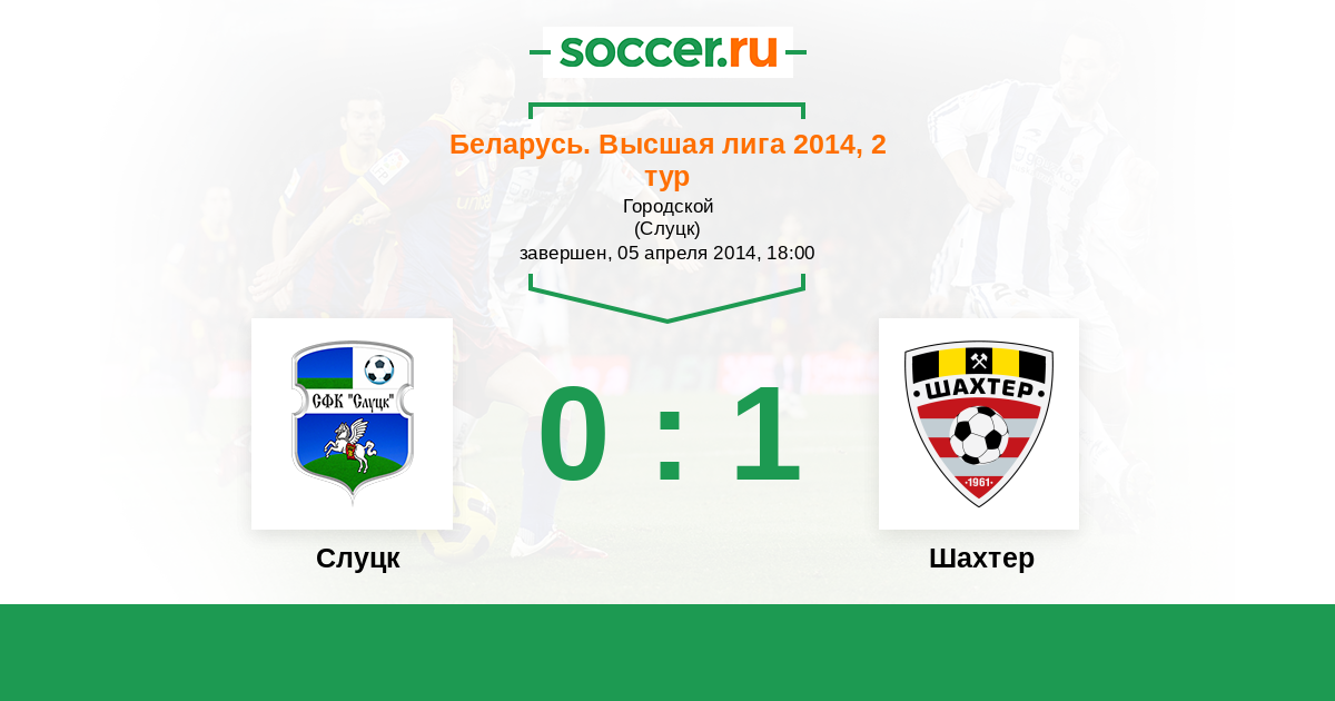 Беларусь. Высшая лига 16.06.2014 Шахтер Логотип футбольный клуб Шахтер (Солигорск) 2:0 Логотип футбольный клуб Слуцк Слуцк