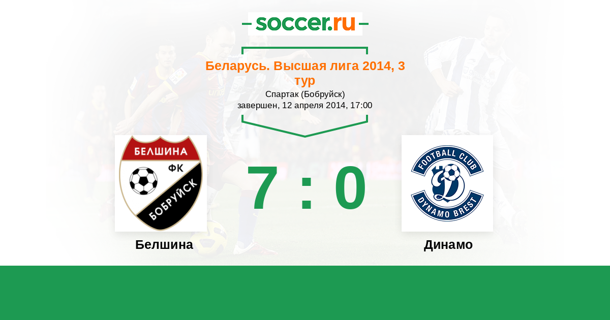 Беларусь. Высшая лига 22.06.2014 Динамо Логотип футбольный клуб Динамо (Брест) 2:2 Логотип футбольный клуб Белшина (Бобруйск) Белшина