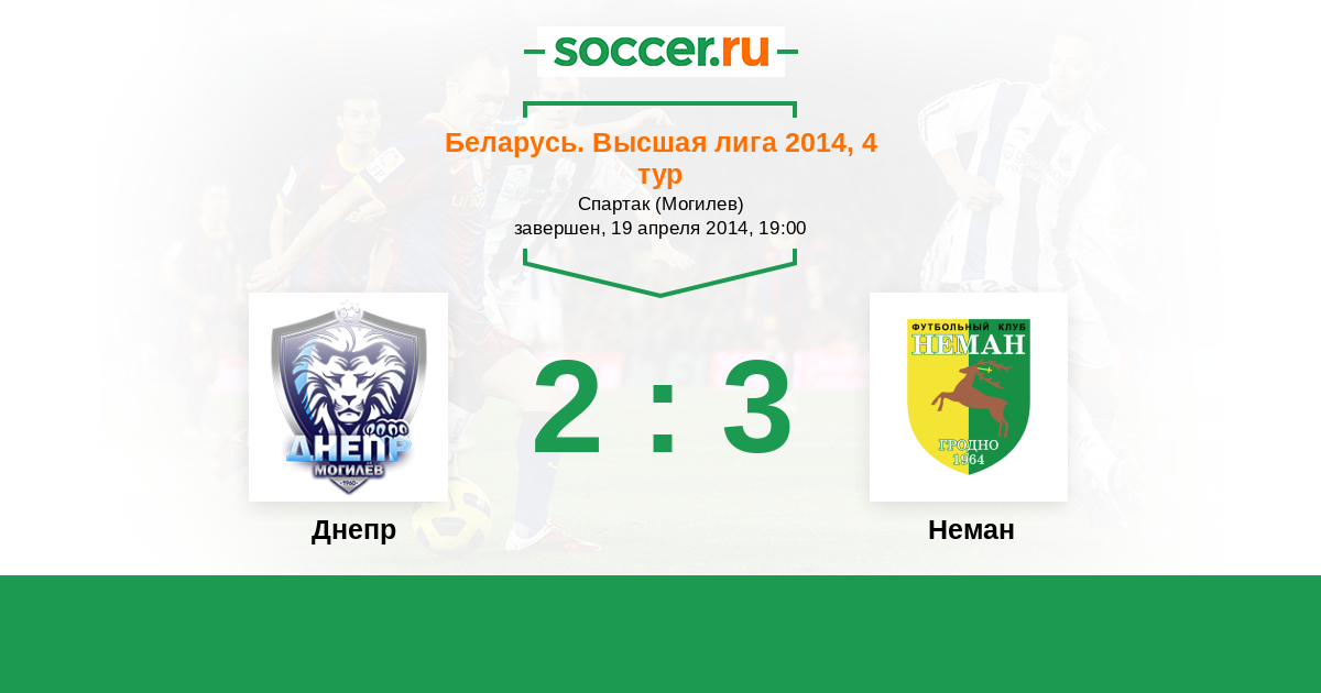 Беларусь. Высшая лига 28.06.2014 Неман Логотип футбольный клуб Неман (Гродно) 4:1 Логотип футбольный клуб Днепр (Могилев) Днепр