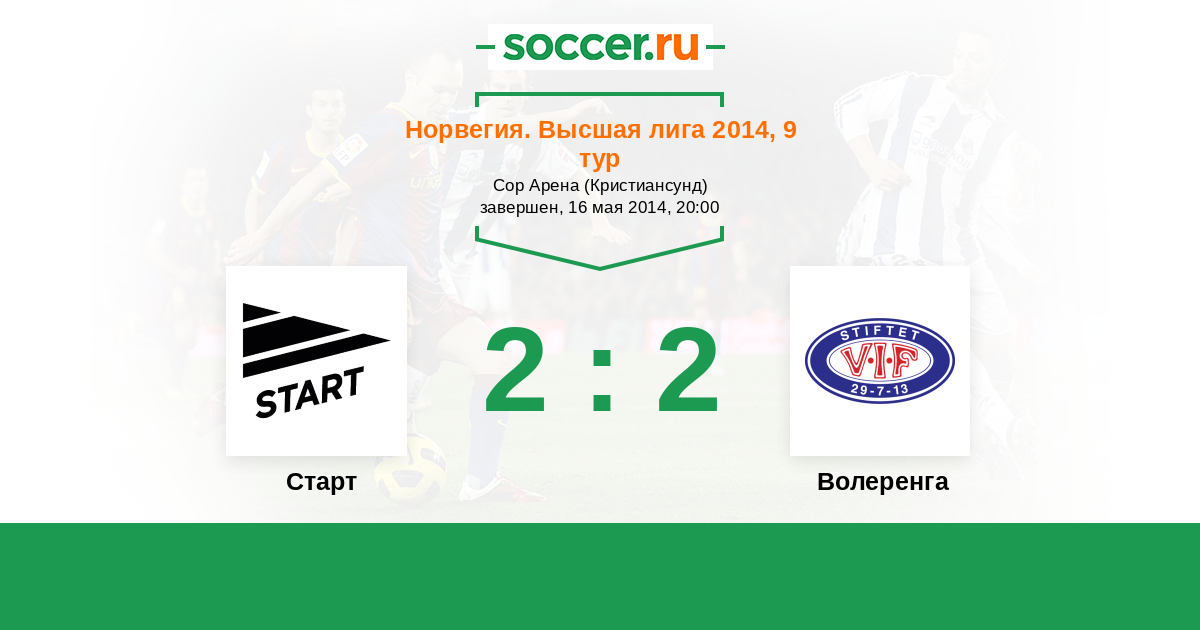 Норвегия. Высшая лига 24.04.2015 Старт Логотип футбольный клуб Старт (Кристиансанд) 2:3 Логотип футбольный клуб Волеренга (Осло) Волеренга
