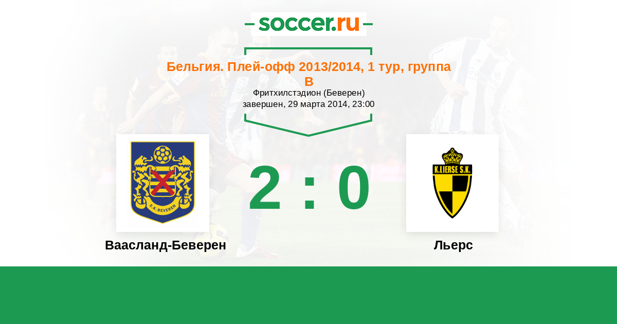 Бельгия. Про-Лига 26.04.2014 Льерс Логотип футбольный клуб Льерс (Лир) 4:2 Логотип футбольный клуб Ваасланд-Беверен Ваасланд-Беверен