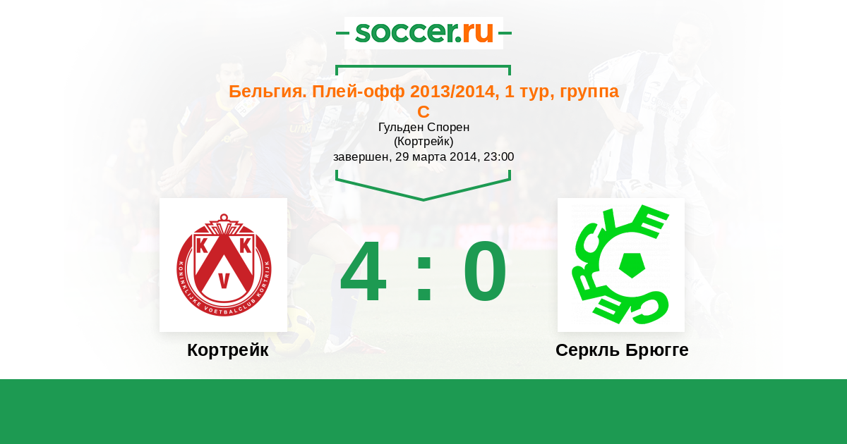 Бельгия. Про-Лига 26.04.2014 Серкль Брюгге Логотип футбольный клуб Серкль Брюгге 0:4 Логотип футбольный клуб Кортрейк Кортрейк