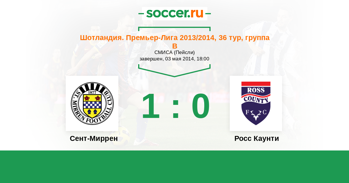 Шотландия. Премьер-Лига 09.05.2015 Росс Каунти Логотип футбольный клуб Росс Каунти (Дингволл) 1:2 Логотип футбольный клуб Сент-Миррен (Пейсли) Сент-Миррен