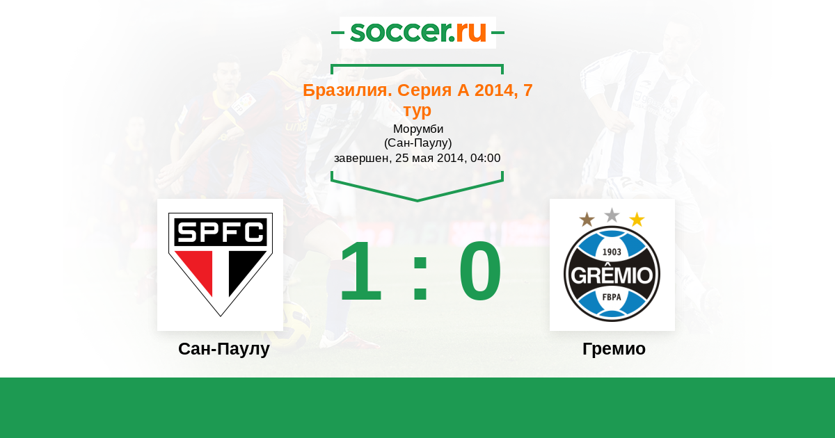 Бразилия. Серия А 04.10.2014 Гремио Логотип футбольный клуб Гремио (Порту-Алегри) 0:1 Логотип футбольный клуб Сан-Паулу Сан-Паулу