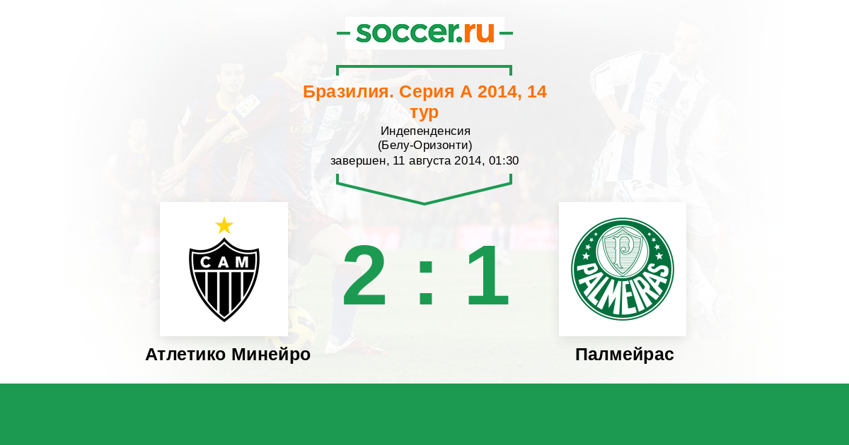 Бразилия. Кубок 28.08.2014 Палмейрас Логотип футбольный клуб Палмейрас (Сан-Паулу) 0:1 Логотип футбольный клуб Атлетико Минейро (Белу-Оризонти) Атлетико Минейро