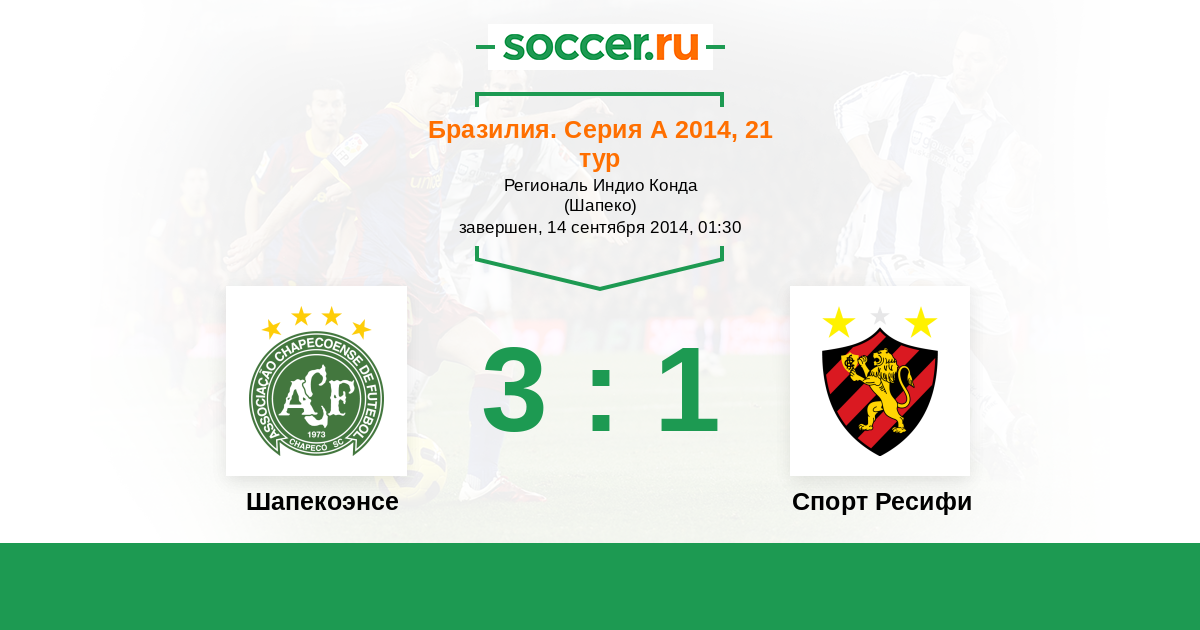 Бразилия. Серия А 28.04.2014 Спорт Ресифи Логотип футбольный клуб Спорт Ресифи 2:1 Логотип футбольный клуб Шапекоэнсе Шапекоэнсе