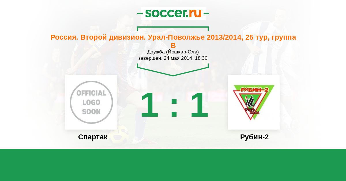 Россия. Вторая лига. Группа 4 18.04.2014 Спартак Логотип футбольный клуб Спартак (Йошкар-Ола) 0:0 Логотип футбольный клуб Рубин-2 (Казань) Рубин-2
