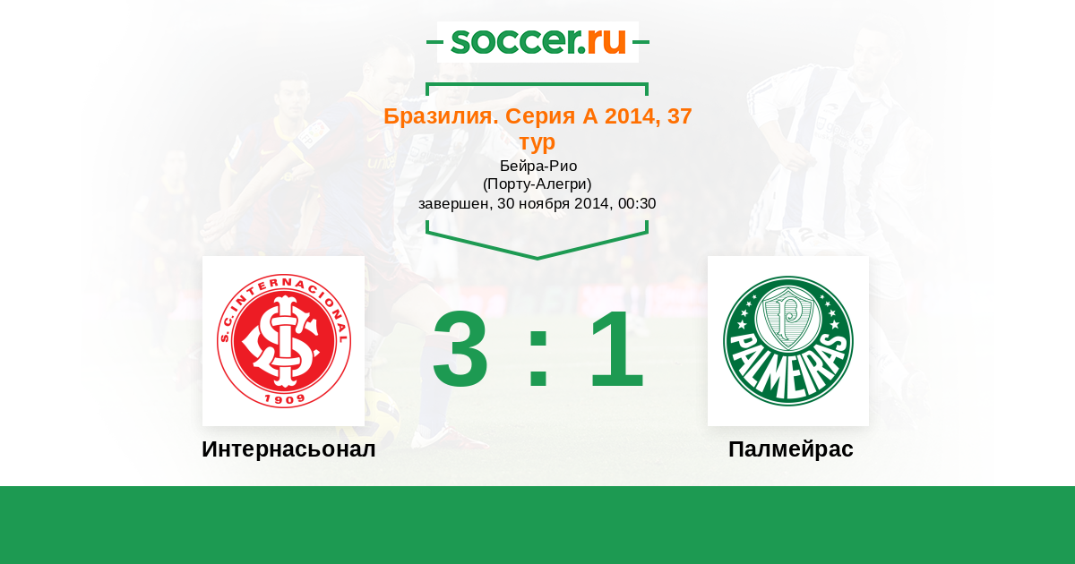 Бразилия. Серия А 31.08.2014 Палмейрас Логотип футбольный клуб Палмейрас (Сан-Паулу) 0:1 Логотип футбольный клуб Интернасьонал (Порту-Алегри) Интернасьонал