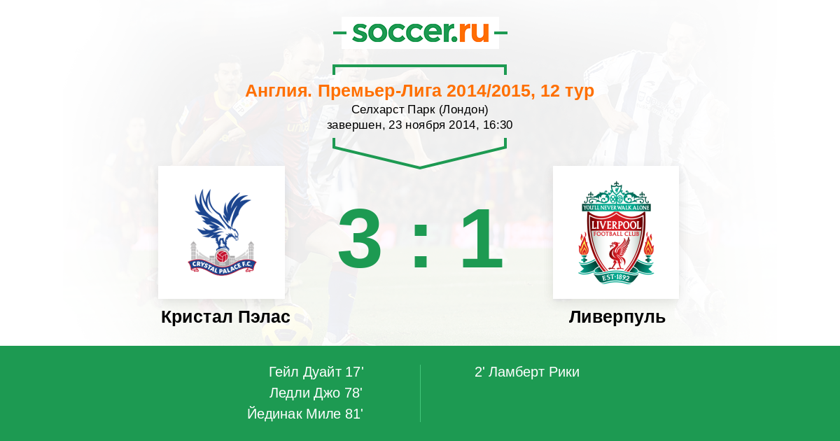 Протокол матча Кристал Пэлас против Ливерпуль