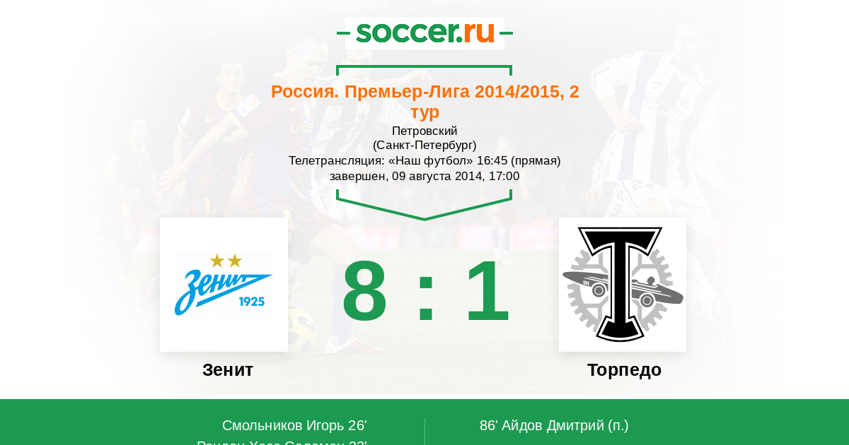 Протокол матча Зенит против Торпедо