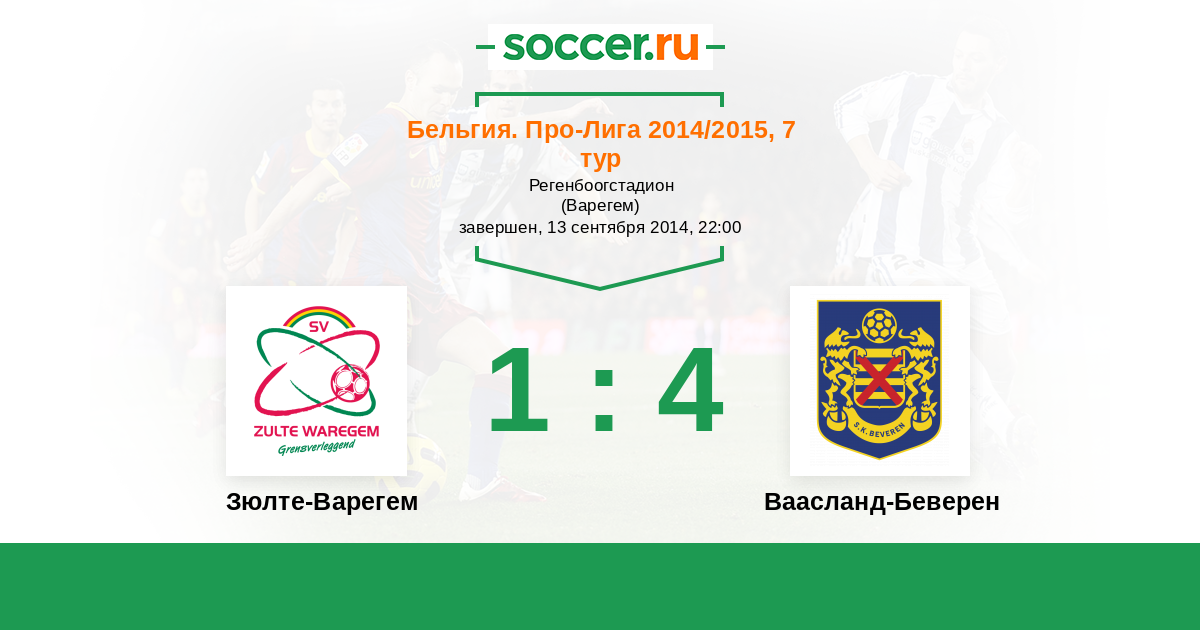 Бельгия. Про-Лига 18.04.2015 Зюлте-Варегем Логотип футбольный клуб Зюлте-Варегем 2:2 Логотип футбольный клуб Ваасланд-Беверен Ваасланд-Беверен